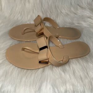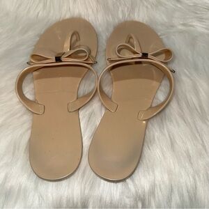 These MICHAEL Michael Kors sandals feature a chic bow detail on a tan leather-like upper, offering a stylish yet minimalist design. The flat thong-style slides are versatile, making them perfect for pairing with a variety of outfits. Their neutral color and clean lines add a touch of elegance to any casual ensemble.