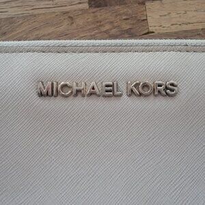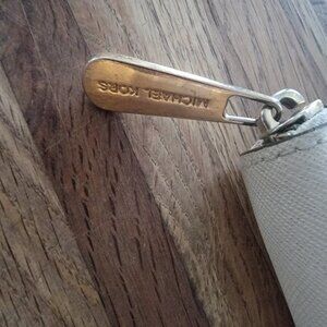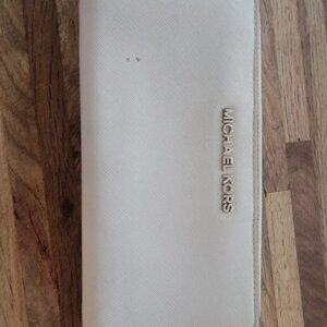 Stylish white wallet by MICHAEL Michael Kors. Features a gold zipper pull. Perfect for any occasion. Wallet has a small spot please check all photos. I purchased this but never ended up using it.