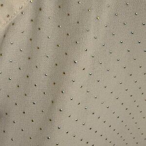 This beautiful blouse has a pattern of white and gold glitter dots, slightly sheer with long sleeves.
