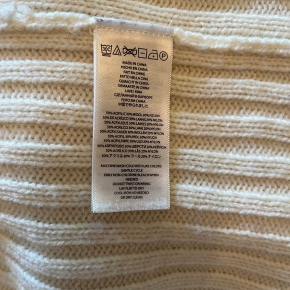 This cardigan by MICHAEL Michael Kors is Size 1X in winter white. It is a heavy, cable knit, warm, cozy sweater with open front. The scarf style collar runs down the from the neck almost to the hem. Look at the photos for more details. There are pockets on both sides. There is no damage, but there is signs of wear in limited pilling. A shaving would help that. A new home that is not South Florida would be best. Please ask if you have questions or want more photos.