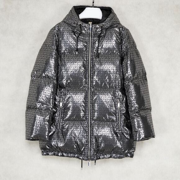MICHAEL Michael Kors Women Reversible Foil Logo Puffer Coat Black/Silver Size S