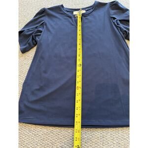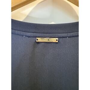 Stylish MICHAEL Michael Kors women’s short sleeve top in a deep navy blue. Features a gold-tone chain detail at the neckline with a keyhole opening for a polished, elevated look. Flutter sleeves add a feminine touch, and the stretch fabric provides comfort and a flattering fit.