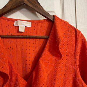 MICHAEL Michael Kors Womens Orange Faux Wrap Eyelet Ruffle Short Sleeve Blouse Small. Measurements Shoulder to shoulder: 15" Underarm to underarm: 20" Length: 26" Sleeve: 8" Offers always welcome! Measurements are approximations taken while hanging
