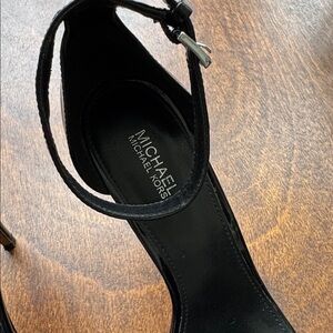 MICHAEL Michael Kors size 7 black patent leather stilettos with sequin bows across the toes and an ankle strap. Heel height is 3-3/4”. Very sexy and surprisingly comfortable. I wear 6.5 or 7 and they fit well. One of the rubber tips has a small chip in it, doesn’t impact wear. There also is some wear on the footbed. See last two pictures.