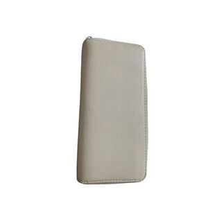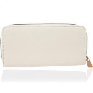 Made from smooth white leather with gold-tone hardware, it's enclosed with a wrap around zip closure.