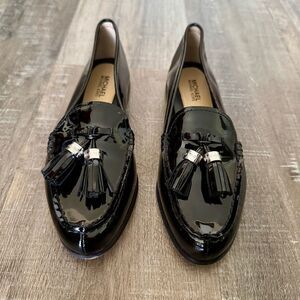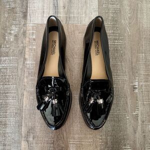 These classic black patent leather flats from MICHAEL Michael Kors feature a timeless loafer design with a sleek tassel detail. The glossy finish adds a touch of sophistication, making them perfect for both formal and casual settings. Enjoy the comfort of a flat sole while maintaining an elegant appearance.