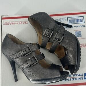 Genuine Leather Silver Metallic Buckle Peep Toe High Heels