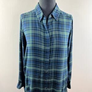 Michael Stars Blue Plaid Button-Down Shirt Top Raw Edge Hem Long Sleeves Size S