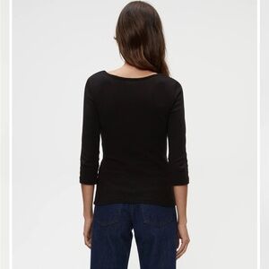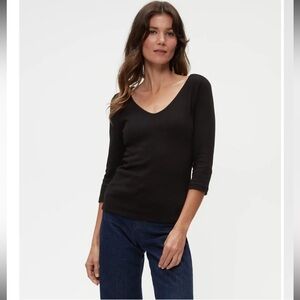 Elegant black tee with a subtle shine. Features a flattering V-neck design. Crafted in our iconic shine fabric, the subtle sheen makes this top a chic day-to-night style. It features a delicate V-neckline and ¾ sleeves. The front is double-layered for a more weighty feel. Wear yours with a midi skirt or pants.