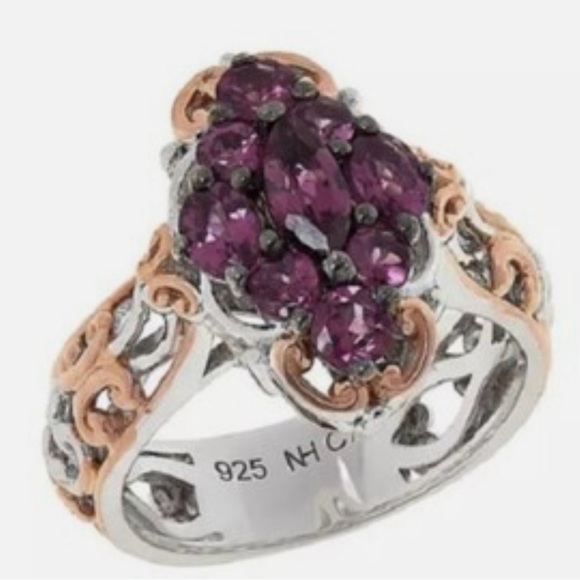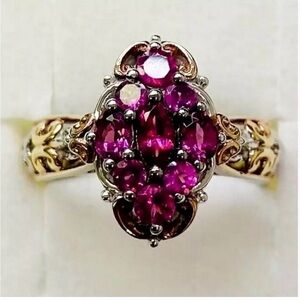 This stunning ring features a captivating garnet gemstone cluster set in a beautiful rose gold and sterling silver band. Perfect for adding a touch of elegance to any outfit. Size 8.