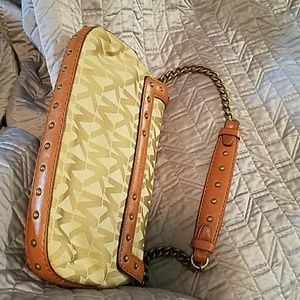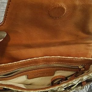 Leather trim with signature Michael Kors print. The handbag body is 10 x 7 with a 7 inch drop.