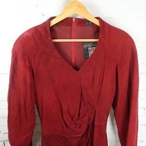 RED SUEDE VINTAGE V NECK LONG SLEEVE DRESS PADDED SHOULDERS LINED GATHERED WAIST DETAIL WOMENS SIZE 5/6 RARE PIECE FROM MICHAEL HOBAN'S SUEDE COLLECTION PURCHASED NEW IN EARLY 1990'S FROM HIS NY BOUTIQUE. GENTLY USED GOOD VINTAGE CONDITION