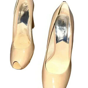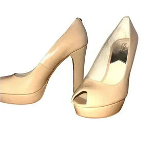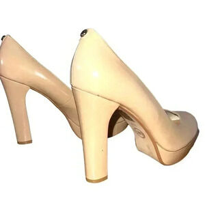 MICHAEL KORS CHANTEL NUDE PATENT LEATHER PLATFORM PUMPS.