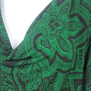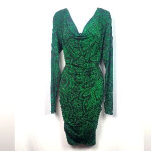 Dress is long-sleeved, midi-length, stretchy polyester pullover dress with a green and black paisley print, featuring a cowl neck and ruched sides. waist runs loose. In great condition.