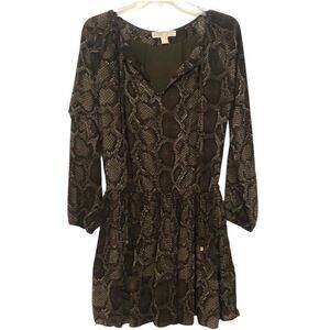 Long billowy sleeves Tie neck Polyester Allover python print Skirt features pleats Very chic & sexy, great for work or play. Looks super cute with boots. Size XS