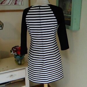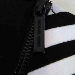 Ponte knit is a more substantial knit that holds its shape beautifully. Decorative zippers at shoulders. Athletic inspired black sleeves. Size 8 measures 40 at chest, 35 at waist, 40 at hips. 33 long from shoulder to hem. Super cute, and comfortable. Like NEW.