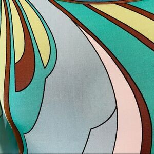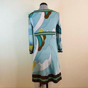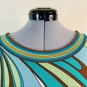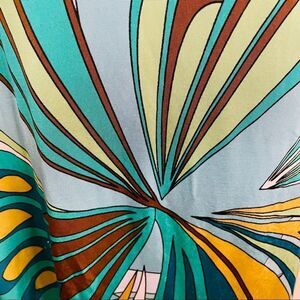 This super cute dress is in excellent pre-owned condition. There is one tiny flaw. There is a tiny, barely noticeable little mark on the front near the top. It will probably come out, but I decided not to stain treat it. The dress is in shards of blues and browns mostly, and feels a bit 70’s retro, which is exactly what was going on in the 90’s-2000’s. The fabric is soft and super stretchy.