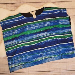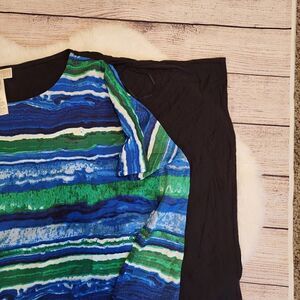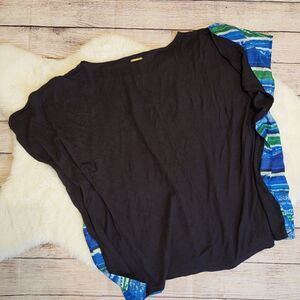 MICHAEL Michael Kors blue/green open bat wing sleeve blouse, back is solid black, thin stretch material, size M, 70% rayon 30% lyocell, excellent condition.