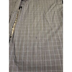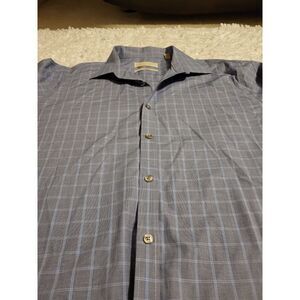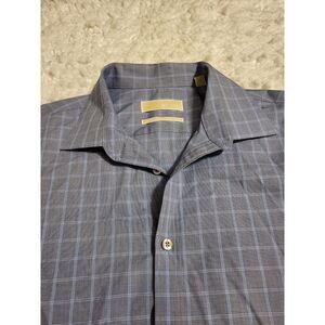 mens MICHAEL Michael Kors regular fit - non iron, collard, long sleeve, cuffs button at wrist, blue/grey tint, 100% cotton, 17.5 neck 34/35, small dark blue stain on front of dress shirt (see pics), great used condition.