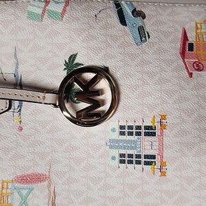 Michael Kors brand Neverfull Mm style tote. Excellent like new pre-owned condition inside and out. Adjustable shoulder straps Two outside large pockets on each side of the bag. Perfect for traveling for simplicity in getting to your phone or wallet quickly. Pink coated canvas exterior. Gold tone hardware. Silky interior lining with one XL pocket and two smaller interior pockets. Top of the bag zips closed, so no bending over and dumping the contents of your bag everywhere.