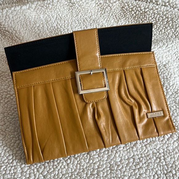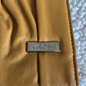 Miche classic shell. Mustard-colored faux leather. Pleated with cute buckle accent and silver hardware. EUC. Smoke free home.