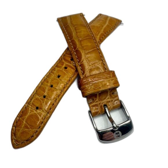 This is an authentic MICHELE genuine alligator leather watch strap in a rich tan shade with the original silver-tone MICHELE buckle. The color is classic and versatile, with natural scale variation that gives alligator leather its signature character.