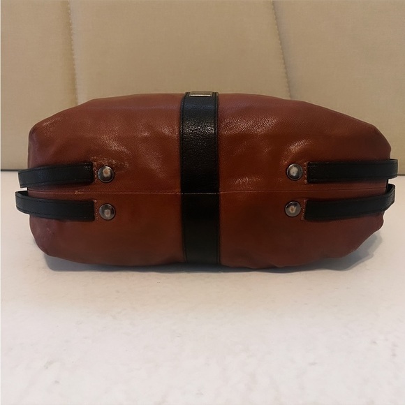 • Body of the bag is brown leather with contrasting black leather accents