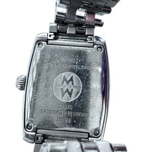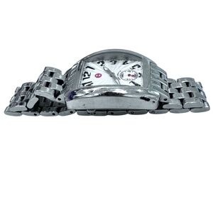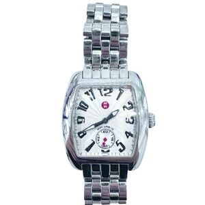 MICHELE Mini Urban Ladies Watch. There are scratches on the stainless parts and on the crystal from wear. See photos. Usually, there is a red disc on the crown. There is not one here. I don't know whether this watch never had one or it was lost. Needs a battery. Overall, in good preowned condition.