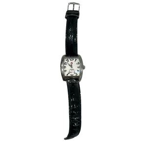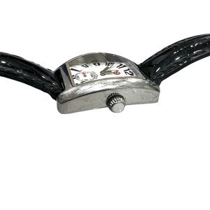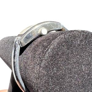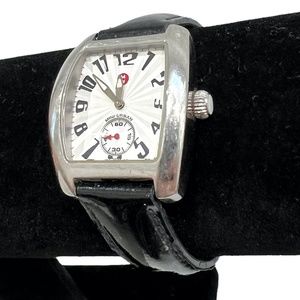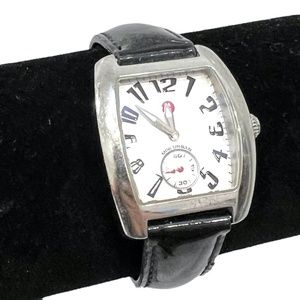 Michele Mini Urban stainless steel watch with matching Michele black patent leather strap. There are scratches from wear on the stainless part of the watch. See pics. The crystal is not scratched. The watchband is very worn. The areas around the holes are cracked. Needs a battery. The watch is in very good preowned condition, the band is only fair.