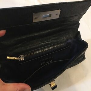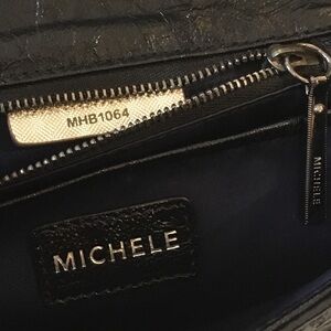 Pre-owned in great condition with normal wear. Michele Handbag is Black patent leather with gunmetal hardware, chain strap, front flap closure and a lined interior with pockets.