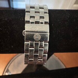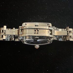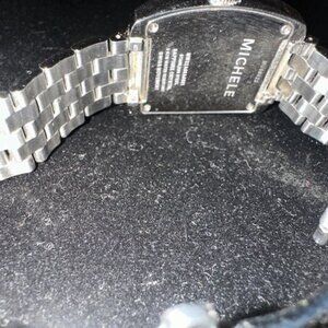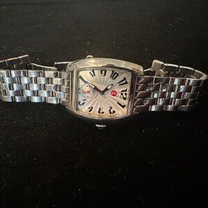 MICHELE URBAN MINI STAINLESS STEEL WATCH - MODEL # - MW02A00A0001. CASE SIZE 35MM X29MM. RECTANGULAR CASE - STAINLESS STEEL. BAND WIDTH 16MM. DIAL - WHITE SILVER SUNRAY. CRYSTAL TYPE - SAPPHIRE. WATER RESISTANT - 5 ATM. MOVEMENT - SWISS. EXCELLENT CONDITION. EXCELLENT WORKING CONDITION. NEW BATTERY