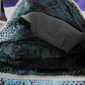 Spacious odor free interior compartment lined in spotless aquamarine snakeskin print fabric