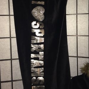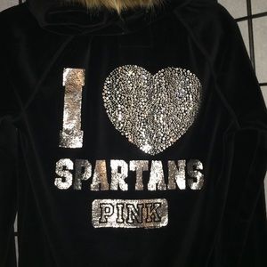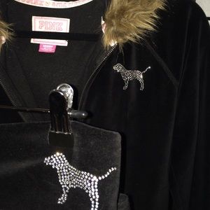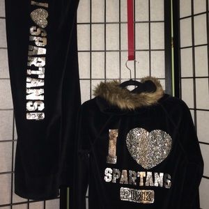 ✨Collegiate Collection✨ BLACK Victoria's Secret 2-Piece Rhinestone Velor Pant Set- Rare Michigan State Hooded Zip-up Jacket has Faux Fur around the edging. Two rhinestone "PINK.DOG" one at the fold over pant waist (right back) and one at left chest on jacket. Jacket has two small pockets and pants are wide legged. Jacket edging on pockets/arms/waist are black with silver threaded pint stripes.