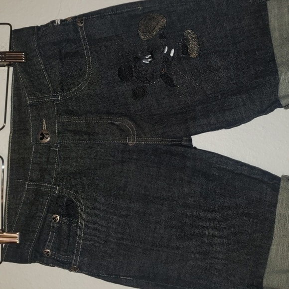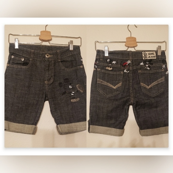 MICKY MOUSE EMBROIDERED BERMUDA DENIM SHORTS. SML black denim. size 27. features are Mickey Mouse on front. embroidered Mickeys across the back yoke. all metal rivets are Mickey's. waist 28" rise 8 1/2" inseam 7". excellent preowned condition.