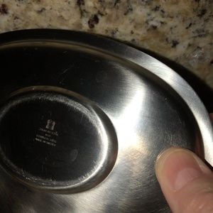 Underside of oval saucer stamped: "CROM. NI. STÅL, 18/8, STAINLESS STEEL, MADE IN SWEDEN".