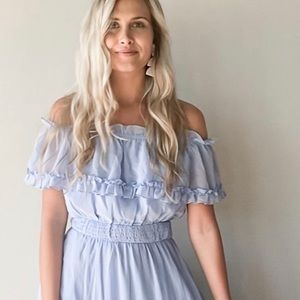 Blue midi, off the shoulder dress. Worn once. Fits TTS