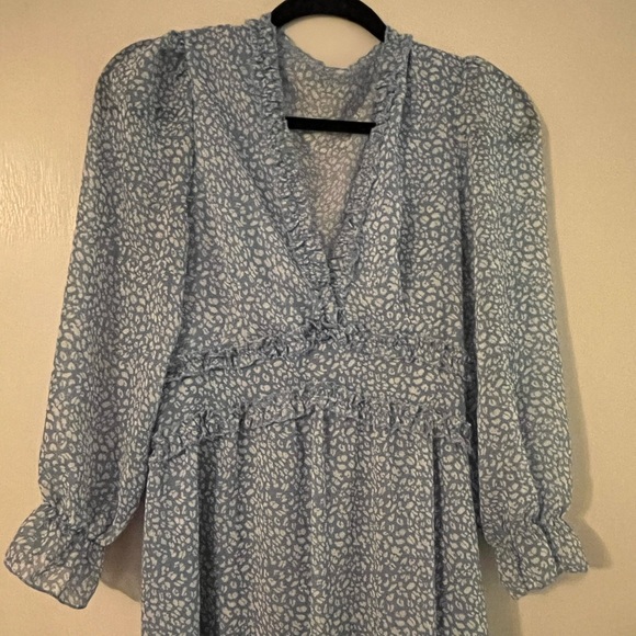 Sheer overlay, lined. Vneck ruffle detail elastic around sleeves. Bump and nursing friendly
