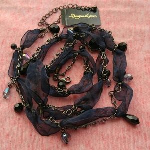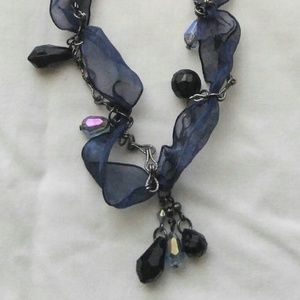 -This bewitchingly beautiful necklace recalls the secret enchantment of midnight! An entrancing combination of gossamer ribbon and sparkling accents, all in a shade of deepest night-sky blue.?