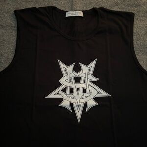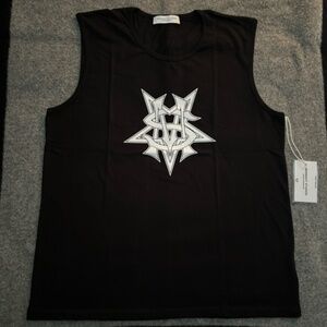 MIDNIGHT STUDIOS Monogram Sleeveless Tank T-Shirt in size LARGE. This shirt was part of Shane Gonzales' FW22 Andy Warhol-inspired Candy Darling capsule. Rib knit crewneck, collar, and armscyes. Logo graphic print at front and back. Item comes from a smoke-free home.
