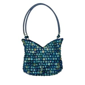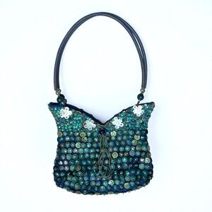 Gorgeous embellished purse by MIDO. This statement handbag features meticulously arranged embellishments to create a stunning, artisan-style look. The body of the bag is covered in large, circular sequins that give it a textured, underwater-inspired feel. The top trim is beautifully detailed with smaller sequins & floral beads with a decorative beaded tassel hanging from the center. The purse is finished with sturdy, rounded handles and a secure zipper closure to keep your essentials safe.