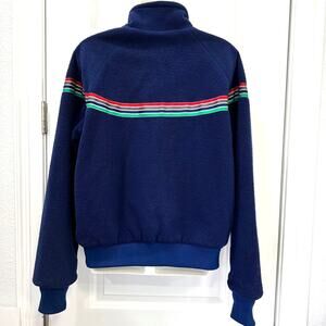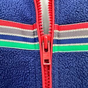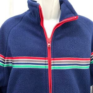 MIGHTY MAC OUT O' GLOUCESTER- BLUE FLEECE JACKET- REFLECTIVE STRIPES- POLARFLEECE- MADE IN USA. Men's size 40 tag, please refer to measurements in picture. The stripes are reflective. Small hole on left cuff, as circled in picture. Doesn't take away from the overall look. No stains. Good pre-owned vintage condition.