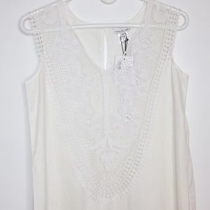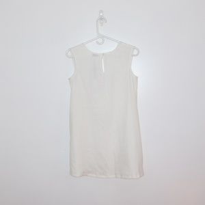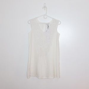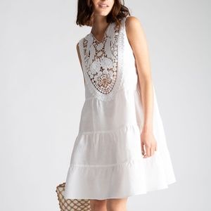MIGUELINA Daphne Dress by INTERMIX. 100% linen. Pure white. Sleeveless. The leaf-lace crocheted yoke neckline. Shift shape **modeled dress is not the exact one listed - photo just gives you an idea of how the dress would look on