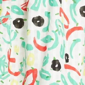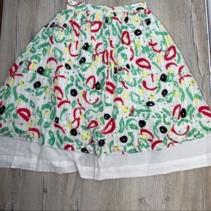 Abstract olives and tomatoes float amount lettuce leaves on this breezy layered A line skirt.