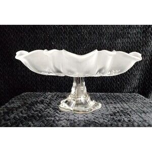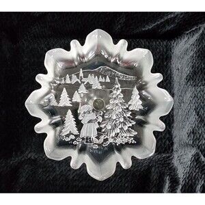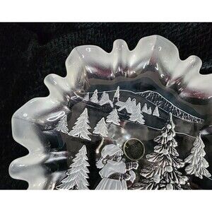 Add a touch of nostalgic holiday charm with this Mikasa Christmas Story Pedestal Dish, produced between 19901996. This frosted glass compote features a raised design of a young girl decorating a Christmas tree, set against a winter forest scene with mountains and evergreens. Its flared, scalloped rim and pedestal base make it perfect for serving candies, nuts, or holiday treatsor for displaying as a festive centerpiece.