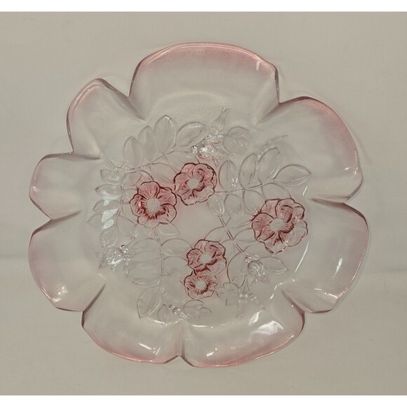 This is a MIKASA Rosella Round Platter of Walther Crystal. It is a clear and pink embossed rose design with round and ruffled edges. It is 12 inches diameter and 2 inches tall. This platter is new but outside of packaging and has not been used. It is in new condition with no damage or defects.