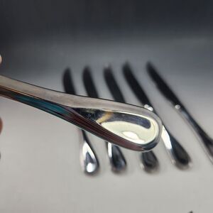Set of 7 serrated steak knives by Mikasa in their Bravo pattern. Please note the handles come in a rounded and a taper handle (no ridge on the handle of the taper pattern), this is the rounded design. They look better in person than the photos show.