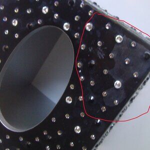 Glossy black with all over pattern of clear and black, large & small crystals.