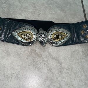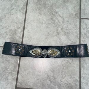 MIKKI G VINTAGE RARE Black Leather Custom-Cast Pewter Gold Swarovski Belt