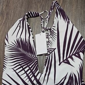 The MIKOH Africa One Piece in Botanical Wine Palm Print is a stylish and sexy one-piece swimsuit perfect for a beach vacation. With a deep V-neck and backless design, this lightweight and stretchy suit in white and purple hues offers a flattering fit for a size M. The floral botanical print adds a touch of tropical boho style, making it a chic choice for women looking to make a statement at the beach or pool. Made from nylon and spandex, this swimsuit is both comfortable and durable, ideal for lounging by the water in style.