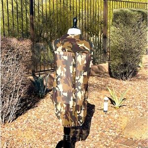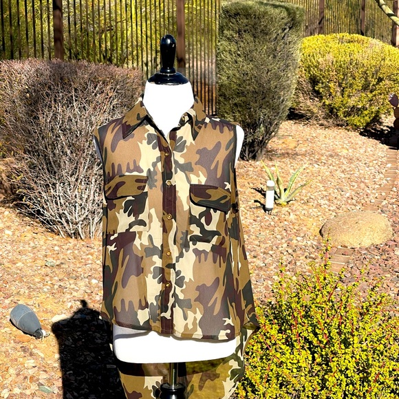 CAMO PRINT, SHEER FABRIC, BUTTON FRONT, TWO FRONT POCKETS, SLEEVELESS, BACK OF TOP HAS DECORATIVE BUTTONS DOWN FULL BACKSIDE LENGTH, BACKSIDE LENGTH IS LONGER THAN THE FRONT PANEL, SIZE L